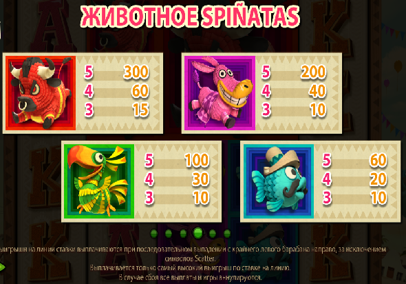 Самый дорогой символ автомата Spinata Grandeбез регистрации это изображение короля корриды – красного быка, он максимально пополнит счет на 300 ставок за полную линию. Остальные Spinatas (животные) символы не слишком далеко по стоимости – осел увеличит ставку в 200 раз, попугай – в 100, а рыба в сомбреро – в 60.
