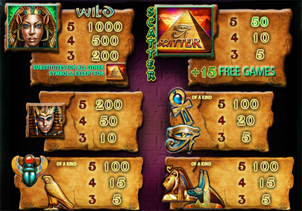 Дикий символ - кошка царицаСкаттер символ - пирамидаБольшинство изображений здесь можно отнести к разряду рядовых. Они отличаются различными коэффициентами, но при этом особого интереса для пользователей не имеют. Ключевым символом в Cat Queen является та самая Кошка-царица. Она здесь в роли дикого символа и именно благодаря ей получится дополнять выигрышные линии и в результате зарабатывать больше. Также отдельного внимания заслуживают Пирамиды, ведь тут они работают как скаттер. Собрав от 3 до 5 таких изображений можно получиться фриспины до 10 штук.