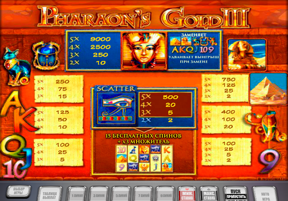 Скаттер Око Фараона: это символ может играть вразброс, в любой части экрана, не завися ни от установленных линий, ни от расположения на барабанах. В отличие от обычных символов в таблице, кредиты за комбинации с Оком Фараона начисляются исходя из общей ставки. Кроме кредитов 3-5 скаттеров запустят серию из пятнадцати бесплатных ходов с множителем 3.