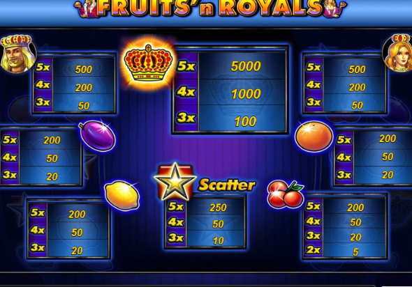 По функционалу игровой автомат Fruits n Royals достаточно простой, потому что тут всего 5 барабанов и столько же линий для выплат