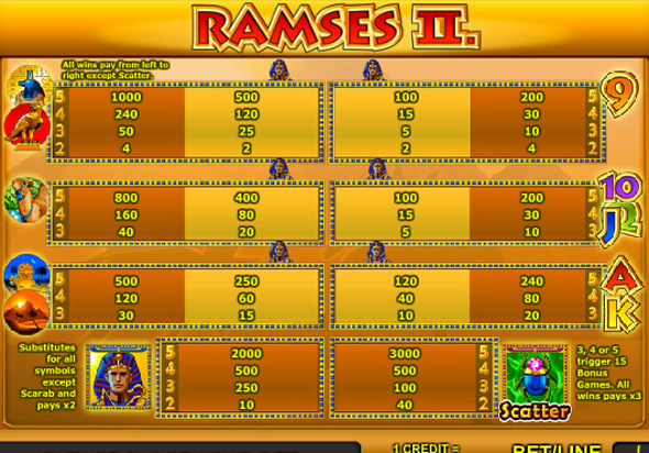 Жук скарабей, извечный символ Египта и его представителей, он становиться символом разброса в данной игре, а так же запускает бесплатные ходы в игре. Его одновременное появление на экране пять раз, сулит игроку умножение общей ставки в 500 раз, четыре картинки умножают доход в 20 раз. Визит жука скарабея на экран Гаминатора три раза означает возможность увеличения ставки в 5 раз, а два подобных изображения умножают поставленные кредиты в 2 раза. Приятной игры.