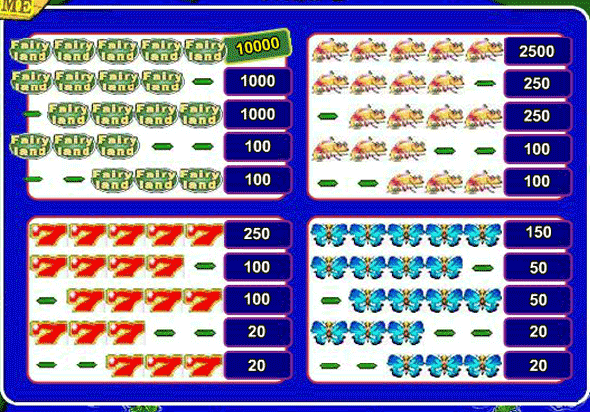 Символ с логотипом игрового автомата «Fairy Land» - самый дорогой в игре, играет только как самостоятельная комбинация. Символ «Хамелеон» второй по стоимости, кроме того это дикий знак, способный играть в других комбинациях, заменяя и дополняя в них символы.