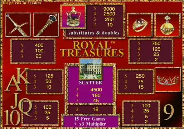 Символ разброса в аппарате Royal TreasuresСимволом разброса является изображение великолепного дворца. Появление этого изображения, в зависимости от количества этого символа на экране, открывают игру на удвоение. Три подобных изображения открывают 15 бесплатных ходов. Если идти по убыванию стоимости символов, то дорогие начинаются с предметов присущим королям, такие как перстень, меч и тиара королевы. Буквы и цифры самые дешевые из перечня изображений.
