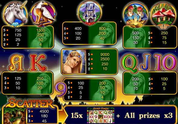Символ с хозяйкой игрового автомата Секретный Лес онлайн – прекрасной белокурой волшебницей с драгоценными камнями в волосах, самый дорогостоящий. Всего два этих символа увеличат ставку на линию в 10 раз, а пять принесут джек пот с 9000-кратным увеличением. Кроме того, обладая свойствами вайлд символа, она способна участвовать в составлении других комбинаций.