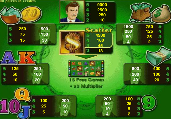 Символ Доллара - скаттер в Игра ДенегСимволы с изображением знака Доллара на золотом фоне – скаттеры, они играют в любом месторасположении на экране и являются вторыми по стоимости символами в игре. Два этих символа увеличат общую ставку в 2 раза, а 5 – в 500 раз. Кроме того, 3, 4 или 5 Долларов запустят 15 бесплатных ходов, все кредиты за комбинации в которых утроятся.